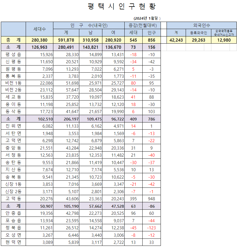 - 평택 고덕 신도시: 고덕 신도시의 개발은 평택시에 새로운 주거 공간을 제공하고 있으며, 이는 인구 증가의 주요 원인 중 하나입니다.