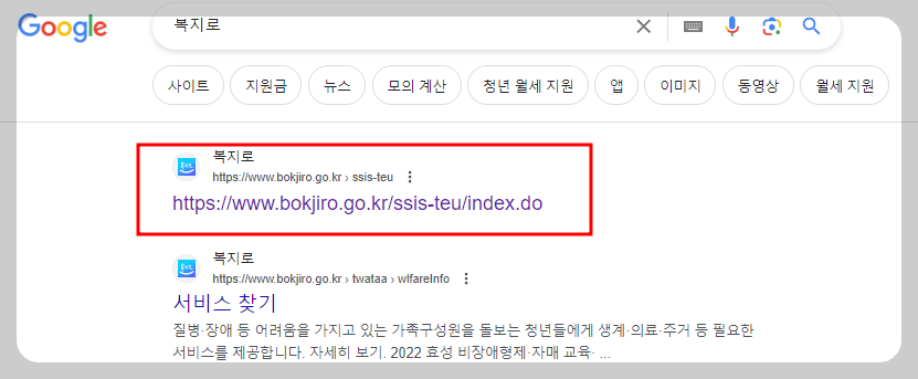 1. 인터넷 검색창에 '복지로' 라고 검색 후 클릭하세요. (아래 링크는 클릭을 하시면 바로 이동합니다.)