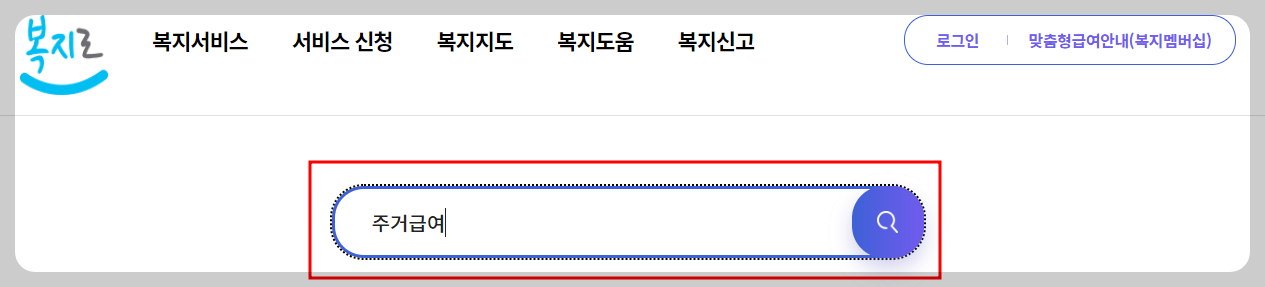 2. 홈페이지 상단 검색창에 '주거급여'라고 입력하고 클릭하세요.